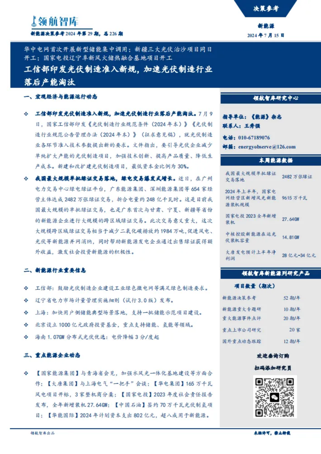 《新能源决策参考》服务国家双碳战略实现,服务能源企业投资决策,秉承“研究创造价值”的理念,力求时效性、专业性、准确性,做能源行业案头必备参考资料。