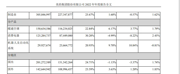 美的集团增速随之下降。2022年,美的集团的营收增速为0.79%,创十年新低,此外,其家用电器销量增速为-2.65%,出现了其上市以来的首次负增长。