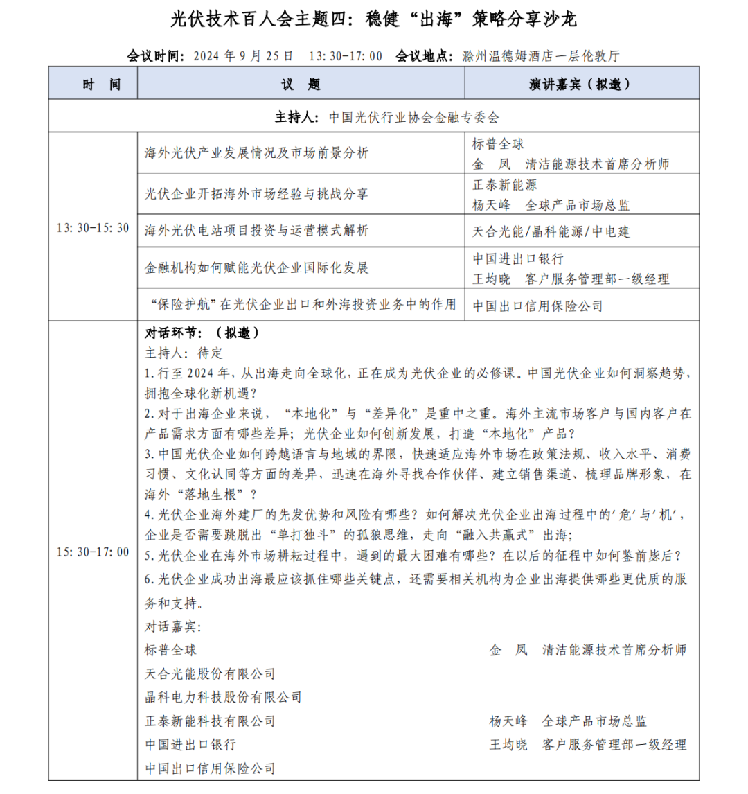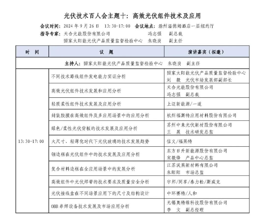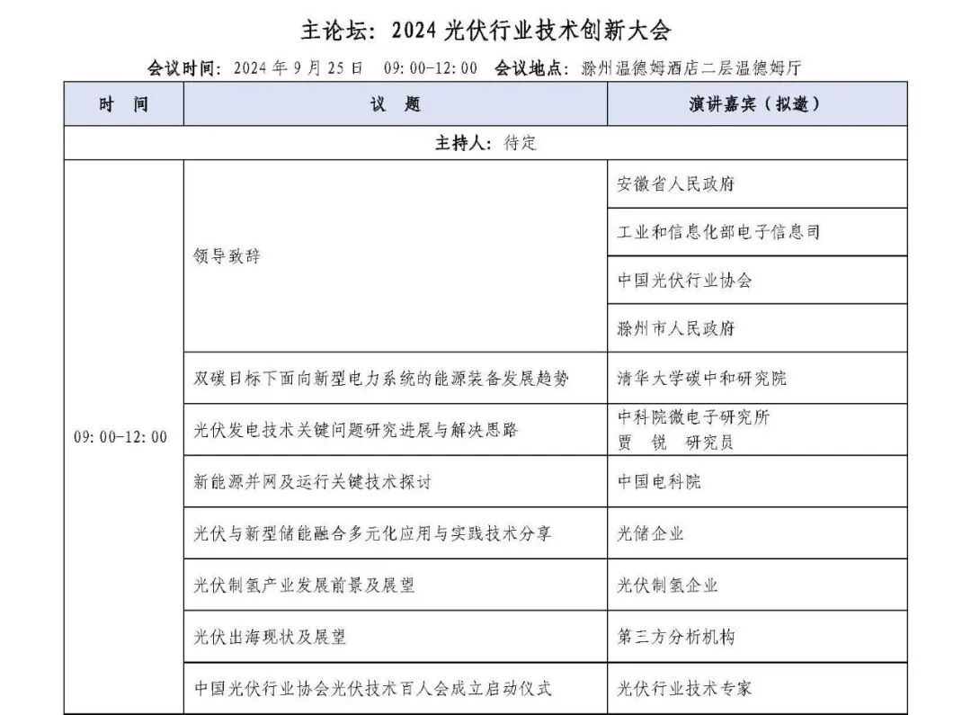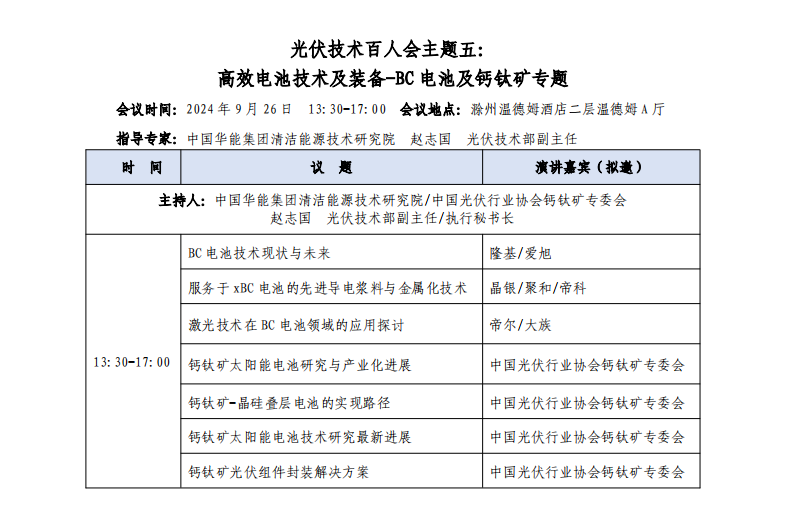 为更好地促进行业交流,中国光伏行业协会拟于2024年9月25-26日在安徽省滁州市召开“2024光伏行业技术创新大会”及同期多场“2024光伏技术百人会专题论坛”。技术创新大会及技术百人会作为协会的年度品牌会议,旨在推动行业技术交流与合作,为行业技术发展带来新的思路与方向,助力加速技术创新与产业发展。