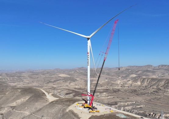 图为龙源电力宁夏海原100万千瓦风电项目首台风机吊装完成