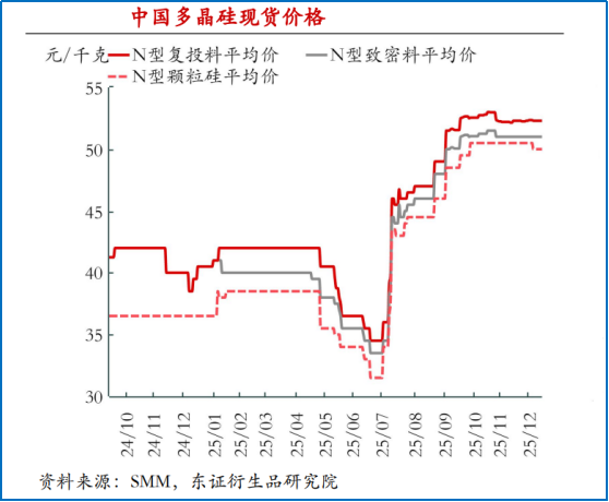 在新产能投放节奏放缓与库存加速消化的双重作用下,多晶硅价格已由2025年7月初最低的35元/kg快速回升至50元/kg以上,初步显现出产能调控的积极效果。