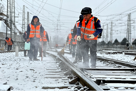 神木北信号工区工长张联超与工友们携带除雪机、融雪剂、扫帚等工具火速赶赴现场,橘红的身影在皑皑白雪中格外醒目。工友们分工协作,铲雪、吹雪、清理道岔缝隙坚冰,一气呵成。寒风裹挟雪粒扑面,汗水浸湿衣背又凝成冰霜,却没有一人退缩。