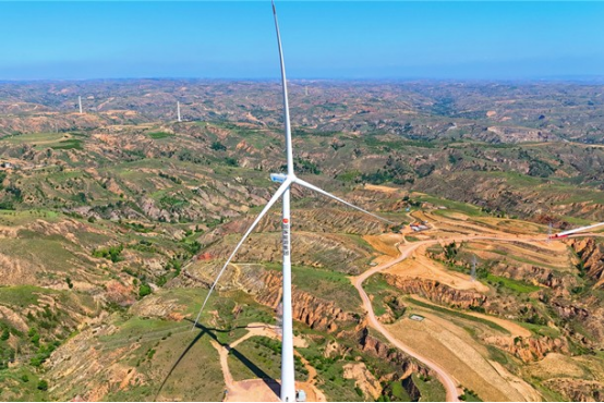 该项目总装机容量20万千瓦,共安装32台单机容量6.25兆瓦的风力发电机组。项目位于黄土高原沟壑区,道路狭窄、坡度大、弯道急,超长叶片与大型风机的运输成为项目推进的主要挑战。为确保设备顺利进场,项目团队提前部署,累计完成98处道路改造和5座桥梁加固,有效打通设备运输“生命线”。项目建设期间,面对降雨、大风等不利天气影响,项目团队建立动态响应机制,加强调度管理,优化施工流程,充分利用风速适宜、雨势间歇的窗口期组织施工,全力推进安装进度,最大限度降低天气对工期的影响。
