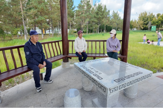 周边群众在新建成的公园凉亭小憩