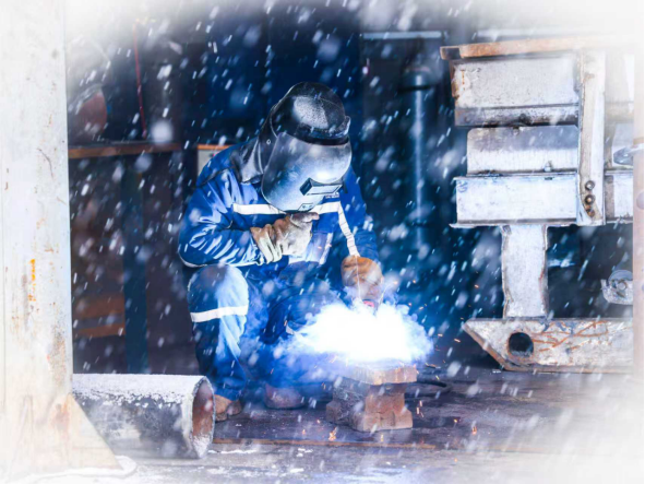 在榆林能源郭家湾矿机修厂,雪花和焊花交相辉映,焊工正在为综掘队焊接除尘风机底座,确保井下设备设施完好。(作品:焊花破雪 作者:张继炫)