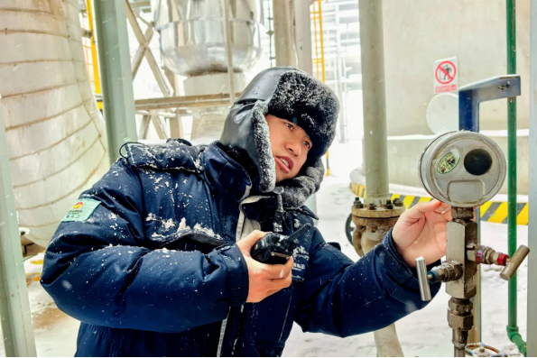 在新疆零下二十多摄氏度的风雪里,新疆化工巡检人员裹着落满霜雪的防寒装备,一手持对讲机待命,一手细致检查设备仪表,在严寒里守好生产运行的每一环。(作品:寒疆守岗 作者:李雪松)