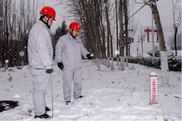 河北公司龙山电厂维护人员冒雪开展供热管线巡线检查,筑牢区域供热安全防线。(作品:雪中巡检 作者:王建涛)