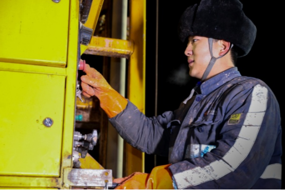 笔者举起相机,取景框里的画面令人动容:曹少飞在操作台上俯身探查,目光紧锁设备参数;孙春利在下方快速打着手势,协调现场动作;刘浩源半跪在钻具旁,紧盯着钻杆的回转与振动,随时准备汇报异常。三人配合默契,在寒夜与设备故障展开较量。