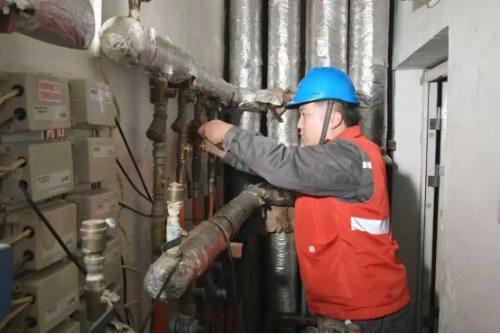 图为工作人员维护小区供热管道