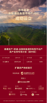 6月17日,泰康资产-财通-远景新能源持有型不动产资产支持专项计划(下称“专项计划”)在上海证券交易所成功发行,总规模2.85亿元。作为市场首单以平价风电场为底层资产的持有型不动产资产支持证券(ABS),该专项计划的成功发行不仅标志着风电资产证券化迈出关键一步,也为有绿色电力和ESG需求的企业提供了创新解决方案。