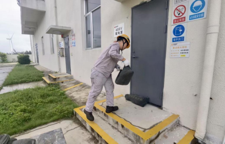 台风登陆前,他们启动“备战—响应—抢修”全链条防御机制。配电室、主控楼门前上百个防汛沙袋堆砌成一堵堵“防御墙”,继保室与主控室玻璃映着双层胶带叠加的“米字形”,室外端子箱包裹上一层层的防水薄膜,用工业扎带捆绑得严严实实,抗风雨能力全面升级,构筑起三重物理防线。
