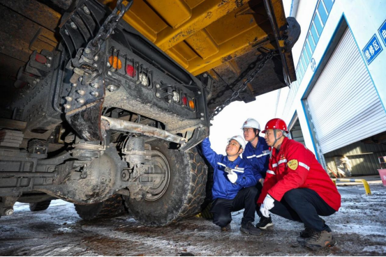 图为肖航(左)带领同事在修理厂对自卸车进行点检