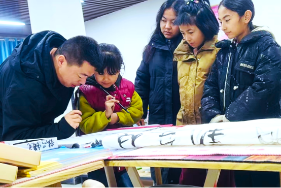 图为在驻村队员的悉心指导下孩子们正专注地学习书法