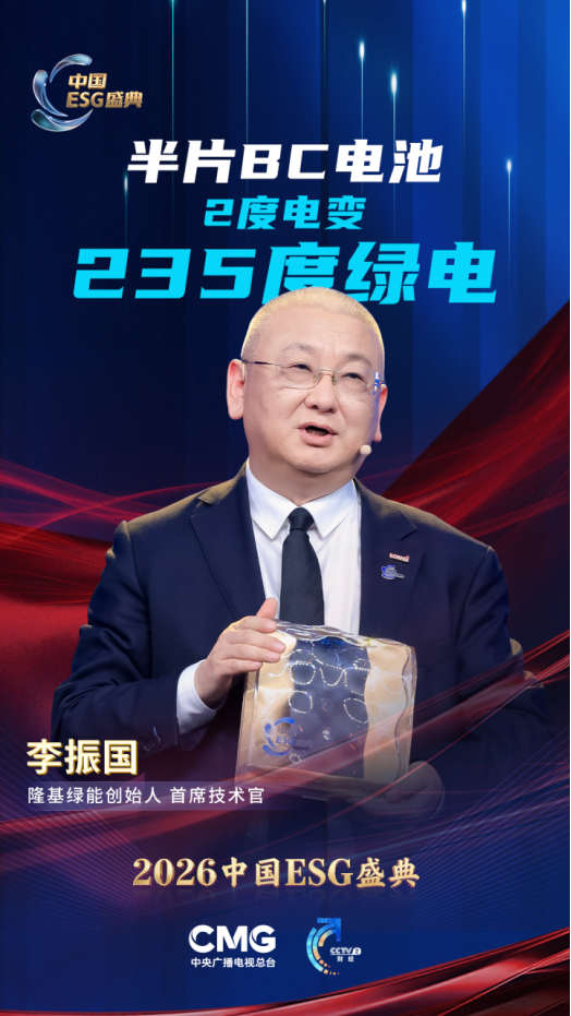 4月11日,由中央广播电视总台主办的“2026中国ESG盛典”正式在央视财经频道播出。作为总台“中国ESG榜样企业”“年度破局企业”代表,隆基绿能创始人、首席技术官李振国携“一方水土”信物——隆基BC技术产品亮相盛典,他以这片小小的电池为引,讲述了隆基以技术创新破解行业困局、以绿色能源推动全球能源公平的温暖实践,更直面光伏行业“内卷”现状,给出了来自隆基的思考与答案。